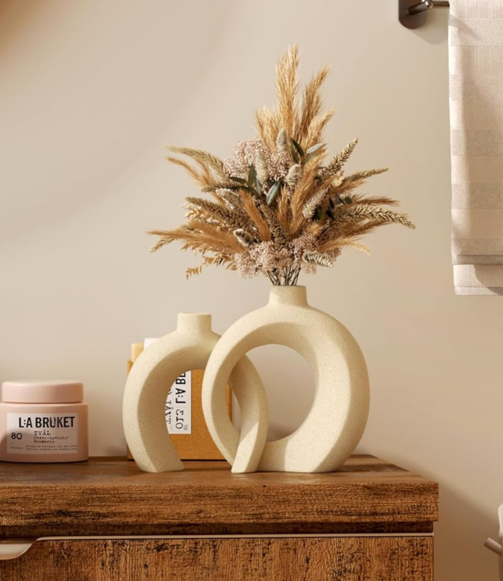 Transform your home with this luxury ceramic vase set of 2. Designed in a sleek modern boho donut shape with matte cream and beige tones, these vases elevate any space with understated elegance.