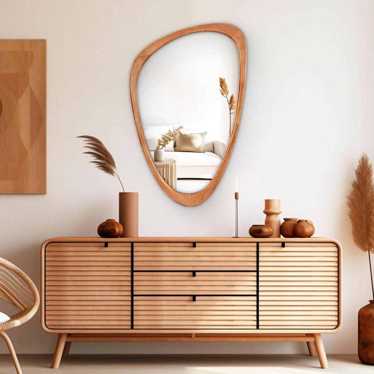 WallBeyond asymmetrical wall mirror, designed with an organic, irregular shape and warm wood frame. Perfect for bedrooms, living rooms, entryways, or halls, this mirror adds a sculptural, mid-century modern touch while enhancing light and space. Its refined design creates a subtle yet luxurious focal point that effortlessly complements minimalist and contemporary interiors.