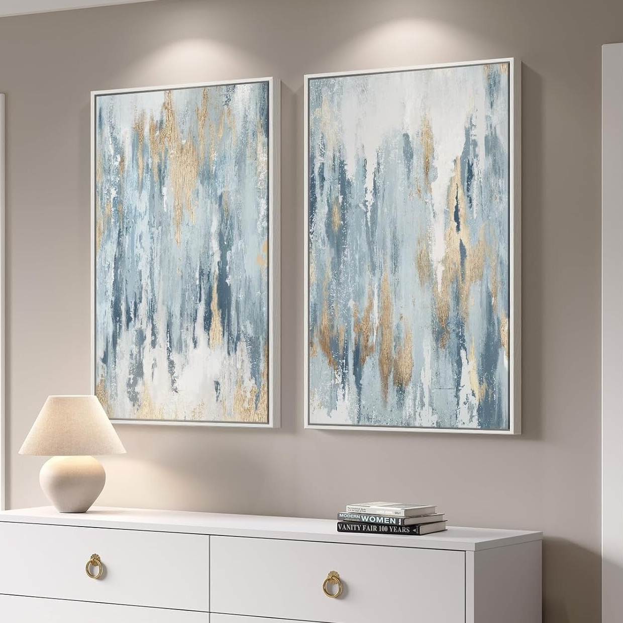 Elevate your interiors with this large 2-piece abstract canvas set featuring blue and gold accents with subtle glitter details. Perfect for living rooms, hallways, dining rooms, or bedrooms, these modern minimalist prints bring luxury, sophistication, and a striking focal point to any wall. The elegant design complements contemporary, minimalist, and high-end décor effortlessly.